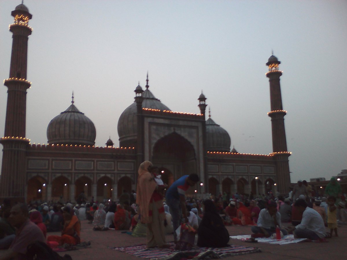 Anubhav led us from Chawari Bazar to Jama Masjid for Iftar. As it was a Saturday, the Nai Sarak-Chawari Bazar stretch was extremely crowded. The entire group walked in rows of twos and threes following Anubhav, up to Jama Masjid, crowding the bazar even further.It was already 7pm by the time we reached the mosque. One girl from the group was wearing a short dress and was not allowed inside. It would have been extremely sad to leave out a group member during Iftar in Iftar walk. At first, I offered my dupatta as a wrap skirt but the sleeveless dress required top covered as well. Both my Sahapedia colleague and I, rushed to the Gate no.3 (Dariba side) from Gate no. 1 (Matia Mahal) to look for gowns they usually offer to foreigners. There were none at Gate no. 1, only lungis which was offered to a foreigner wearing shorts. The guy who had gowns decided to act difficult and refused for some reason. I named the person I knew who had given us the shooting permission and it worked! She finally entered the premises wearing a long gown over her dress.
